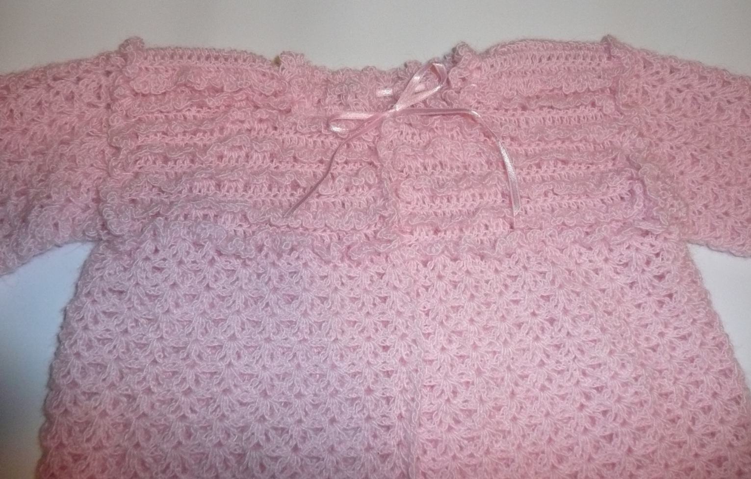 I made this baby hat based on a baby hat pattern by Lion Brand. (Click on the link on the left to see the pattern) I used a very fine baby yarn and a 2.5 mm crochet hook. I modified the pattern and used that pattern stitch called for in the Ribbed Neck Jacket in the rows without decreases, so that they would match. A pompom is added as a finishing touch.
